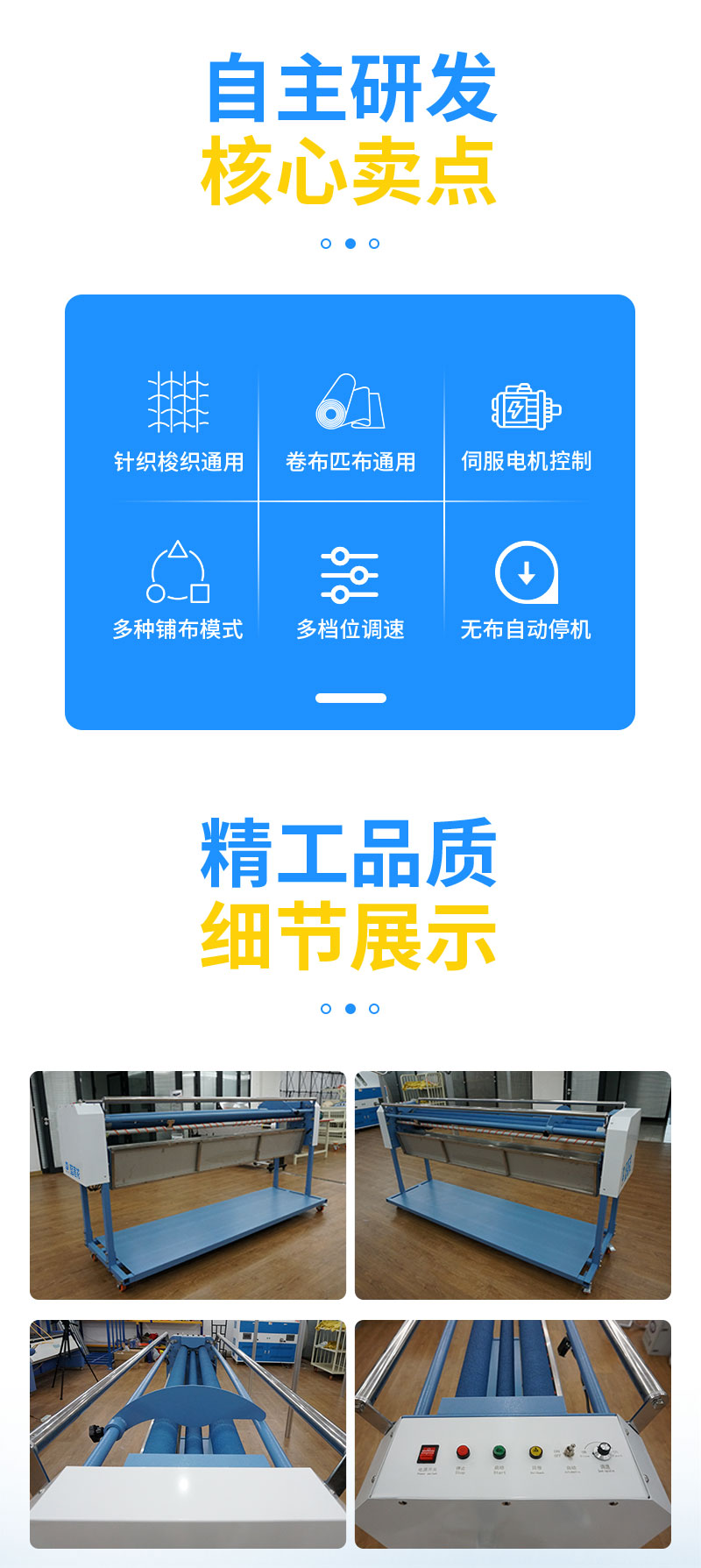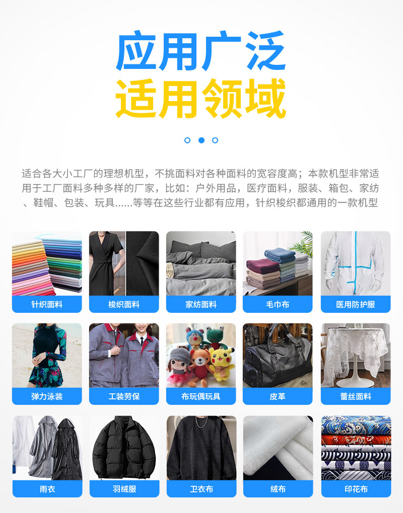 內(nèi)置電子調(diào)速器控制;可自動回卷有問題的布料;配有光電感應(yīng)布料,無布自動停機(jī)功能;配有可剎車的移動腳輪,方便移動固定。
